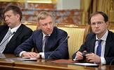 Церемония представления членов нового правительства России в Доме правительства. Слева направо: министр культуры Владимир Мединский, министр образования и науки Дмитрий Ливанов и министр здравоохранения и социального развития Вероника Скворцова после церемонии.