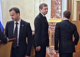Церемония представления членов нового правительства России в Доме правительства. Слева направо: заместитель председателя правительства России Аркадий Дворкович, заместитель председателя правительства России, руководитель аппарата правительства России Владислав Сурков и председатель правительства России Дмитрий Медведев во время церемонии.