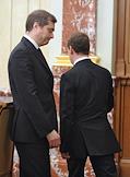Церемония представления членов нового правительства России в Доме правительства. Заместитель председателя правительства России, руководитель аппарата правительства России Владислав Сурков (слева) и председатель правительства России Дмитрий Медведев (справа) во время церемонии.