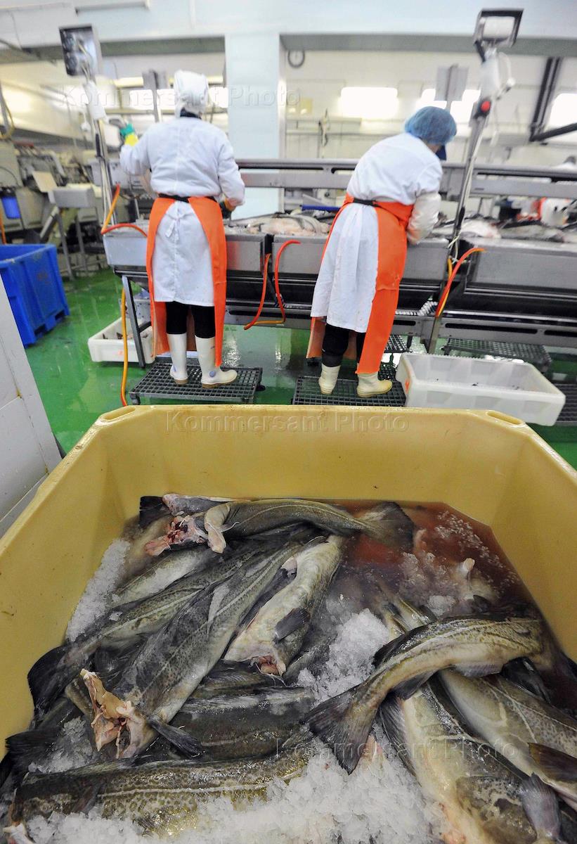 Рыбоперерабатывающее предприятие "Мурманские рыбопродукты" на территории Морского рыбного порта. Разделка трески.