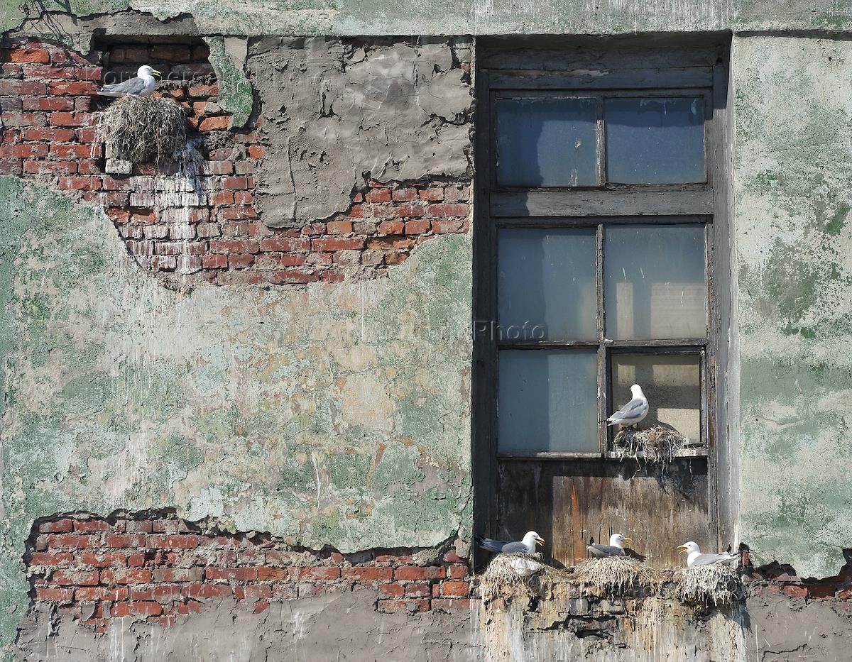 Gulls nesting on the facade of the building in the fishing seaport of Murmansk.