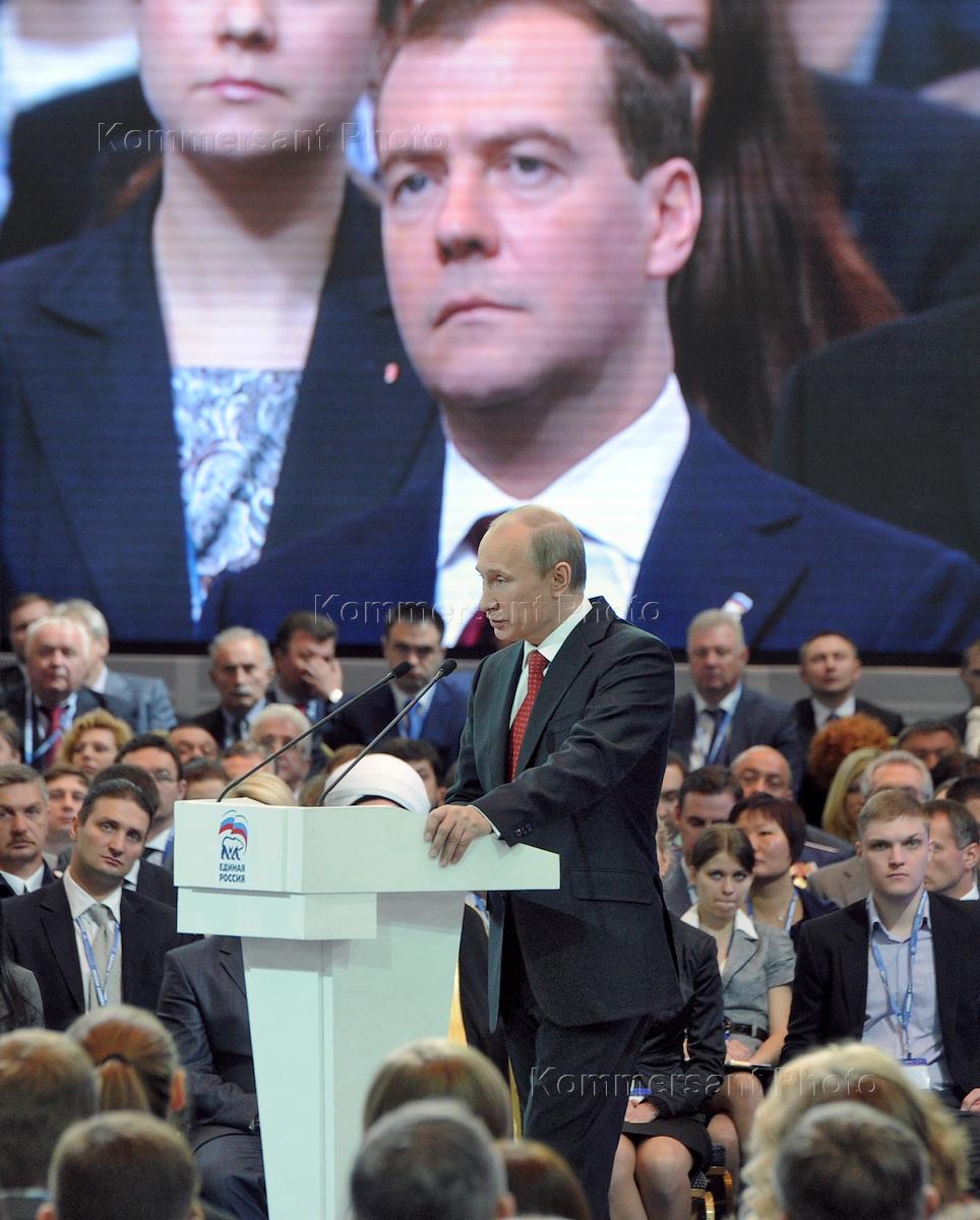 Председатель правительства России Дмитрий Медведев (слева) и президент России Владимир Путин (справа) на заседании XIII Съезда Всероссийской политической партии "Единая Россия" в Центральном выставочном зале "Манеж".