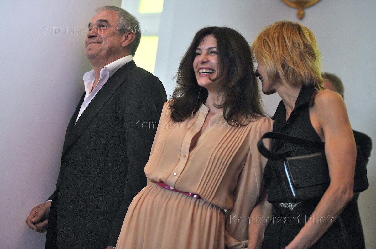 XII открытый фестиваль искусств "Черешневый лес" 2012. Слева направо: директор фестиваля "Черешневый лес" Эдит Куснирович, актер Олег Меньшиков с супругой Анастасией Черновой на церемонии вручения премии Олега Янковского "Творческое открытие 2011-2012". Церемония прошла в Доме Пашкова.