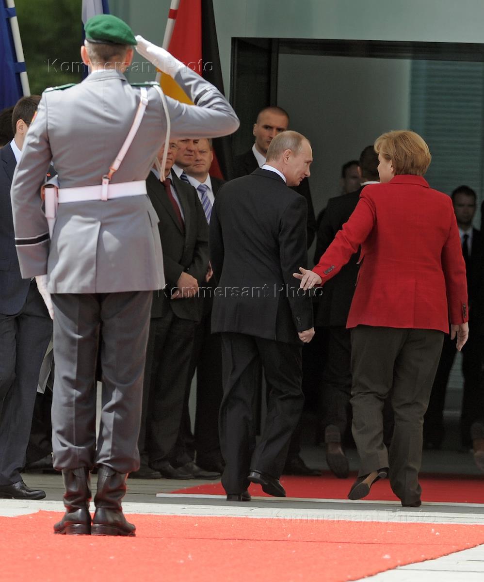 Рабочий визит президента России Владимира Путина в Берлин. Президент России Владимир Путин (слева) и федеральный канцлер Федеративной Республики Германия Ангела Меркель (справа) во время торжественной церемонии встречи у здания Ведомства Федерального канцлера.