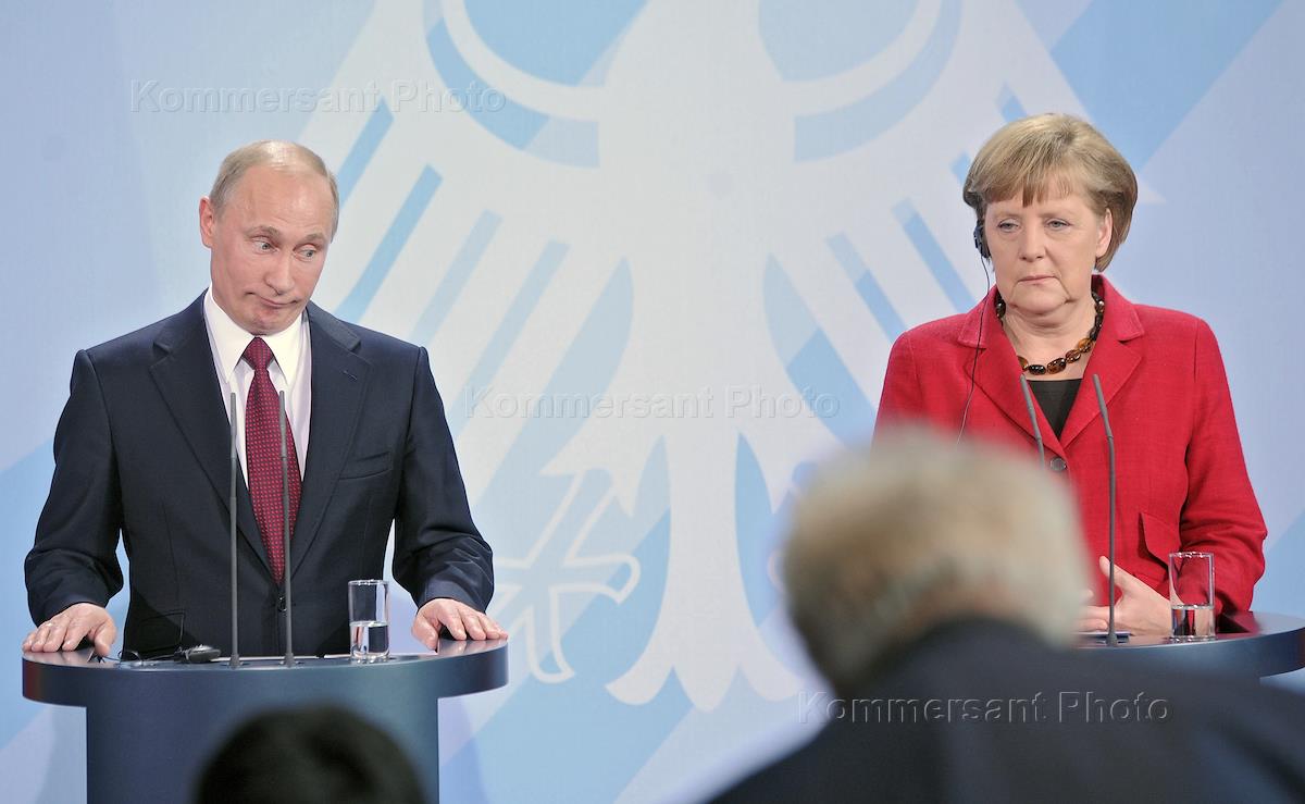 Рабочий визит президента России Владимира Путина в Берлин. Президент России Владимир Путин (слева) и федеральный канцлер Федеративной Республики Германия Ангела Меркель (справа) во время совместной пресс-конференции.