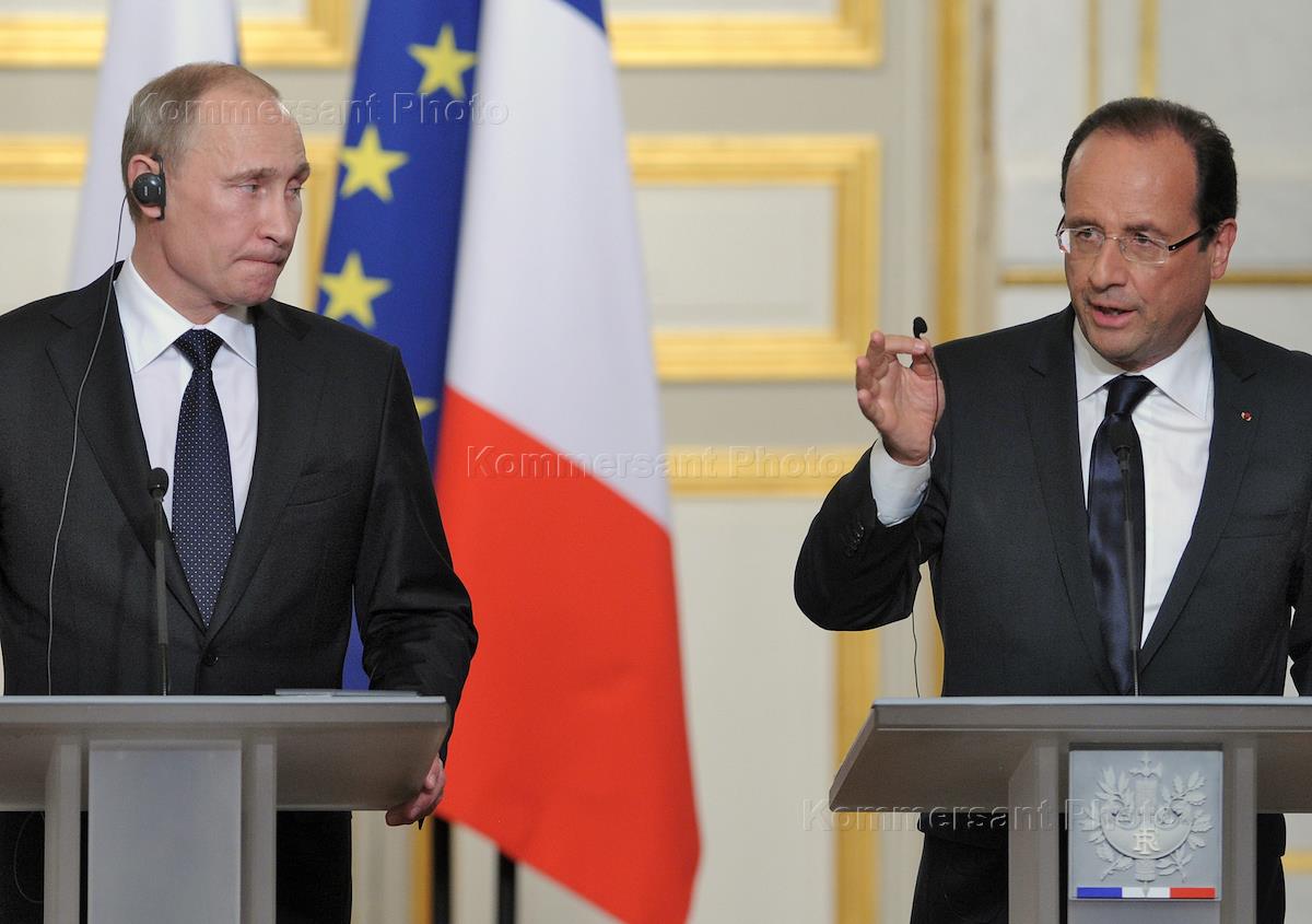 Рабочий визит президента России Владимира Путина во Францию. Президент России Владимир Путин (слева) и президент Франции Франсуа Олланд (справа) во время совместной пресс-конференции.