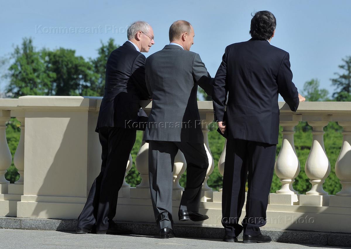 The summit Russia - European Union (EU). Left to right: President of the European Council Herman Van Rompuy, Russian President Vladimir Putin and European Commission President Jose Manuel Barroso before the Russia - European Union summit in the Constantine Palace in Strelna.