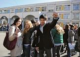 Школьники и приемная комиссия перед сдачей Единого Государственного экзамена (ЕГЭ) по французскому языку в "Школе здоровья" №149.