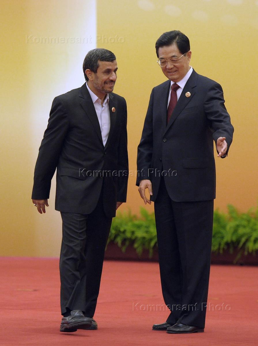The Summit of Shanghai Cooperation Organization (SCO). President Hu Jintao of China (right) and President of Iran, Mahmoud Ahmadinejad prior to a joint photograph of the SCO participants.