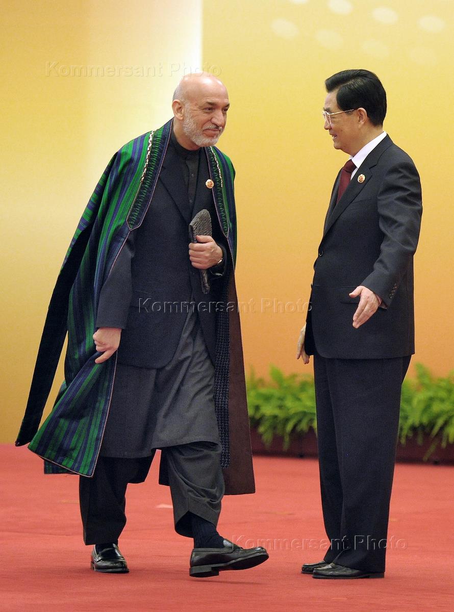 The Summit of Shanghai Cooperation Organization (SCO). President Hu Jintao of China (right) and President of the Islamic Republic of Afghanistan Hamid Karzai before the beginning of the meeting.