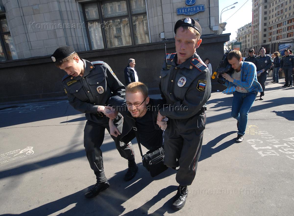Сотрудники полиции во время задержания председателя Российской объединенной демократической партии "Яблоко" Сергея Митрохина (в центре) вместе с участниками акции против поправок, подготовленных Государственной думой России, в Административный кодекс и ФЗ 54 "О собраниях, митингах, демонстрациях, шествиях и пикетировании". Акция прошла у здания Госдумы.