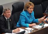 Слева направо: представитель в Совете Федерации (СФ) России от исполнительного органа государственной власти Брянской области Людмила Нарусова, представитель СФ от законодательного (представительного) органа государственной власти Калужской области Алексей Александров и представитель СФ от исполнительного органа государственной власти Калужской области Валерий Сударенков на пленарном заседании СФ.