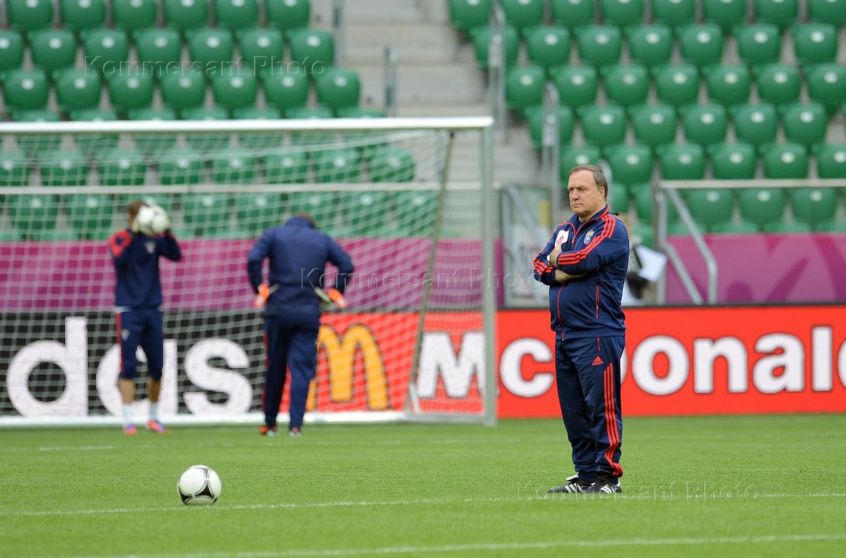 Чемпионат Европы по футболу UEFA EURO (Евро 2012). Главный тренер сборной России по футболу Дик Адвокат (справа) во время тренировки сборной России перед матчем с чешской сборной.