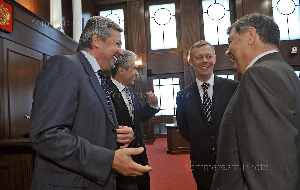 Председатель Федерального арбитражного суда Центрального округа (ФАС ЦО) Олег Свириденко (второй слева), заместитель председателя Высшего арбитражного суда России Артур Абсалямов (второй справа) и губернатор Калужской области Анатолий Артамонов (справа) на церемонии открытия нового здания Федерального арбитражного суда Центрального округа.