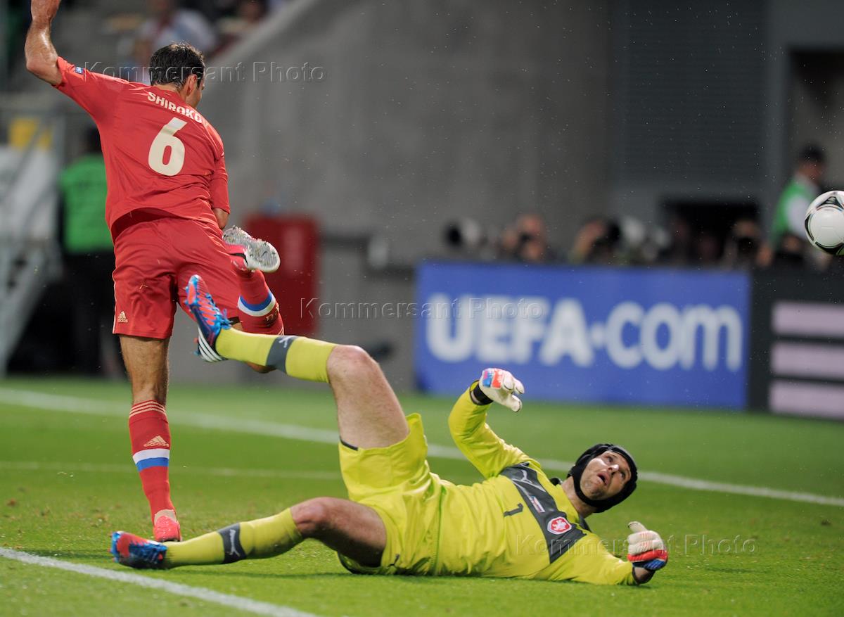 UEFA European Football Championship UEFA EURO (Euro 2012). Player of the national team of Russia Roman Shirokov (left) and goalkeeper of the national football team of the Czech Republic Petr Cech (right) during a match between the national teams of Russia and the Czech Republic. The match took place at the stadium "Miejski".