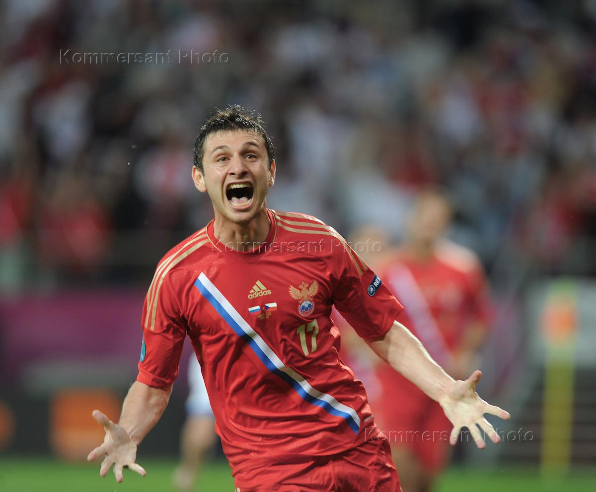 Чемпионат Европы по футболу UEFA EURO (Евро 2012). Футболист сборной России Александр Кержаков во время матча между сборными командами России и Чехии. Матч прошел на стадионе "Мейски".