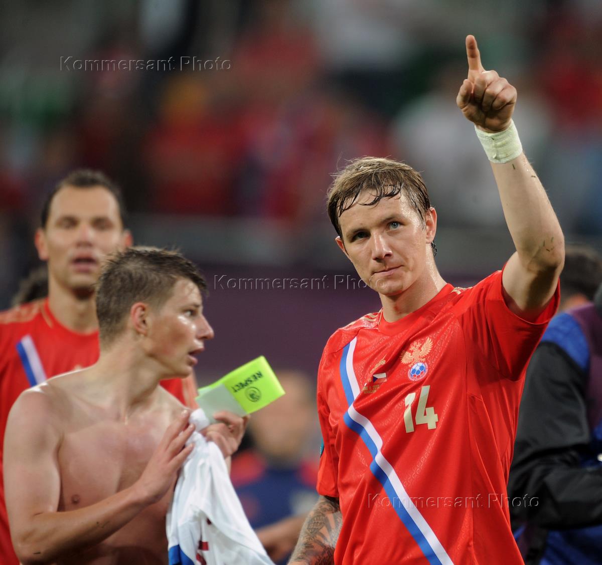 Чемпионат Европы по футболу UEFA EURO (Евро 2012). Футболисты Андрей Аршавин (слева) и Роман Павлюченко (справа) во время матча между сборными командами России и Чехии. Матч прошел на стадионе "Мейски".