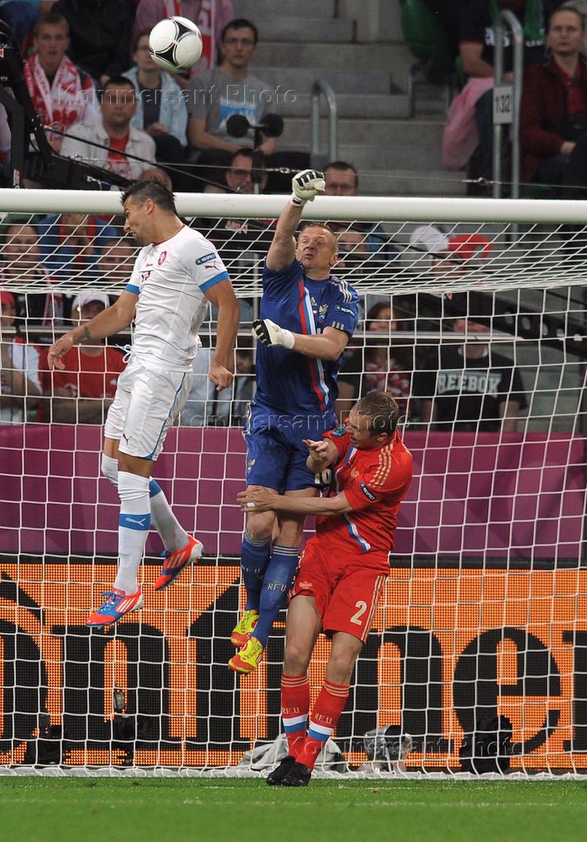 Чемпионат Европы UEFA по футболу "EURO 2012". Вратарь сборной команды России по футболу Вячеслав Малафеев (слева) и игрок сборной Чехии Милаш Барош (в центре) во время матча между сборными командами России и Чехии. Матч прошел на стадионе "Мейски".