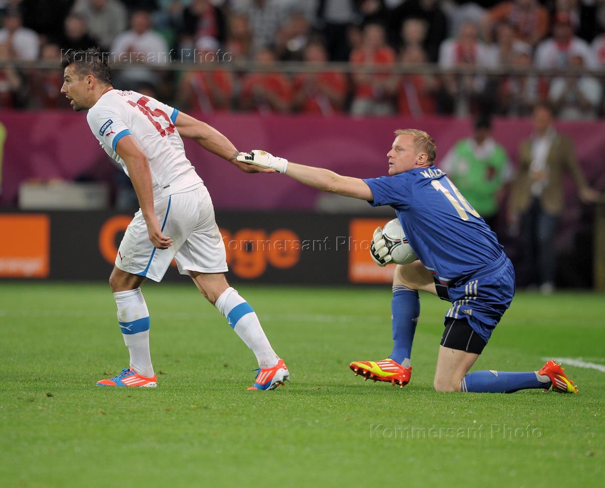 UEFA European Football Championship UEFA EURO (Euro 2012). Goalkeeper of the Russian national football team Vyacheslav Malafeev (left) and the Czech Republic national team player Milash Baros (center) during the match between the national teams of Russia and the Czech Republic. The match took place at the stadium "Miejski".
