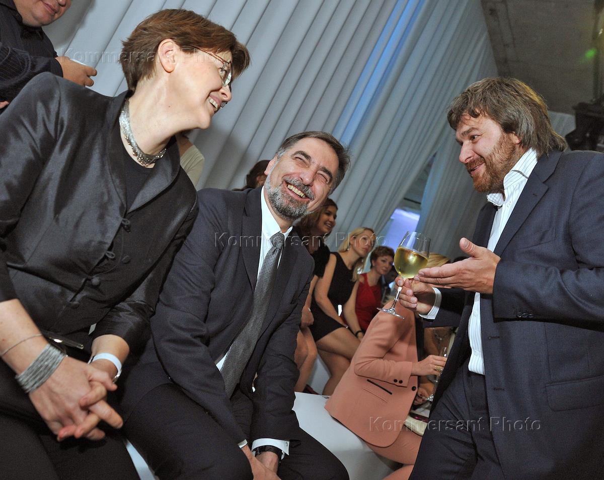 Architect Sergey Skuratov (center) with his wife (left) and General Director of "Building Trust-DS" Aslan Temirov (right) during the presentation of real estate of de luxe class from "Donstroy" and fashion show by designer Elie Saab at the Penthouse The Residence.