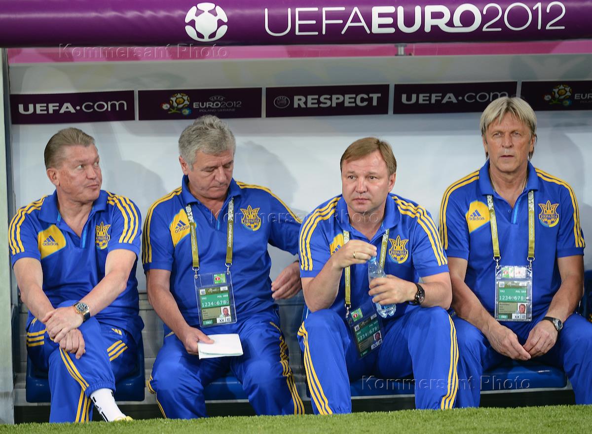 Чемпионат Европы по футболу UEFA EURO (Евро 2012). Главный тренер сборной Украины Олег Блохин (слева) с тренерским штабом во время матча между сборными командами Украины и Швеции.