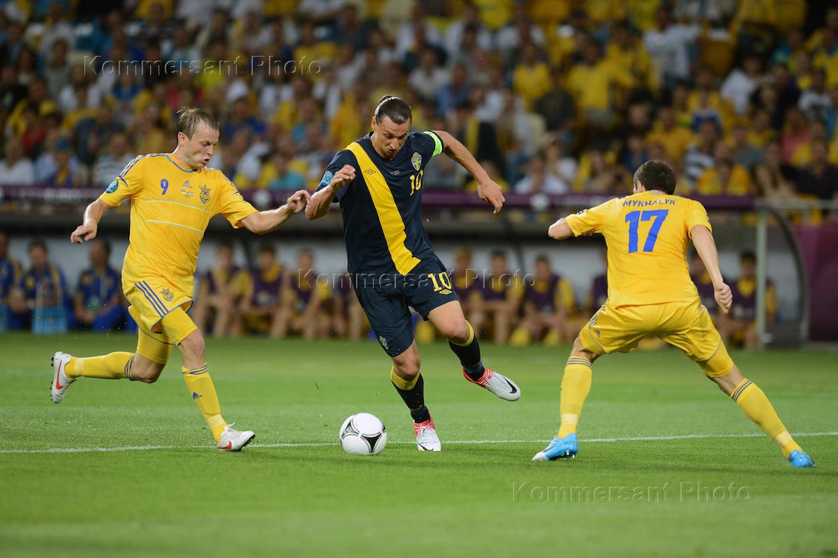Чемпионат Европы по футболу UEFA EURO (Евро 2012). Игроки сборной Украины Олег Гусев (слева) и Тарас Михалик (справа), игрок сборной Швеции Златан Ибрагимович (в центре) во время матча между сборными командами Украины и Швеции.