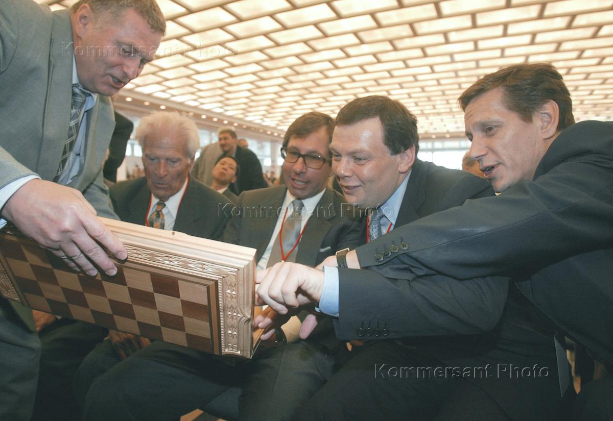 Лидер ЛДПР, заместитель председателя Государственной Думы России Владимир Жириновский (слева), президент "Альфа-банка" Петр Авен (третий слева), председатель совета директоров консорциума "Альфа-групп" Михаил Фридман (второй справа) и председатель Комитета Государственной Думы России по бюджету и налогам Александр Жуков (справа) во время шахматного матча между сборными России и остального мира в Государственном Кремлевском дворце.