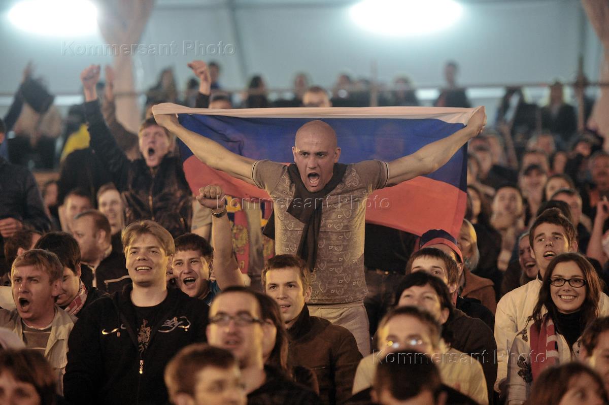 European Football Championship (Euro 2012). EURO 2012 Fan Zone in the Gorky Central Park of Culture and Leisure. Fans during the broadcast of a match between the teams of Russia and the Czech Republic.