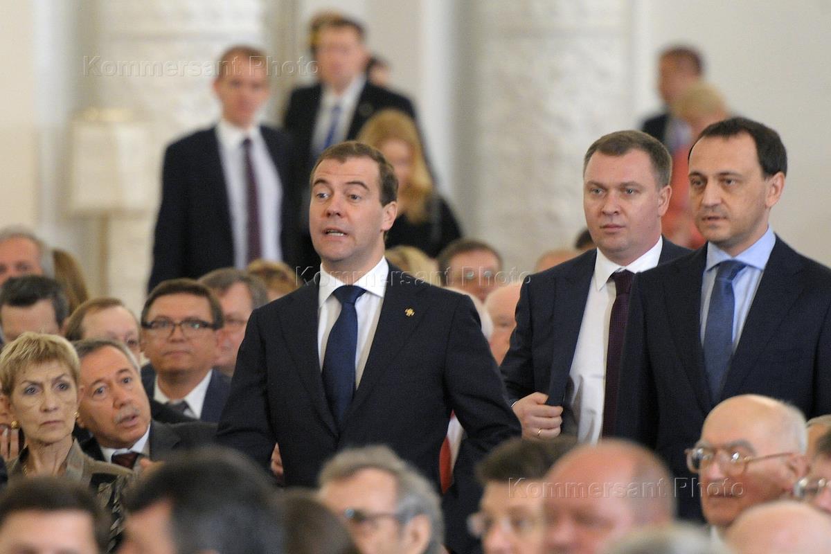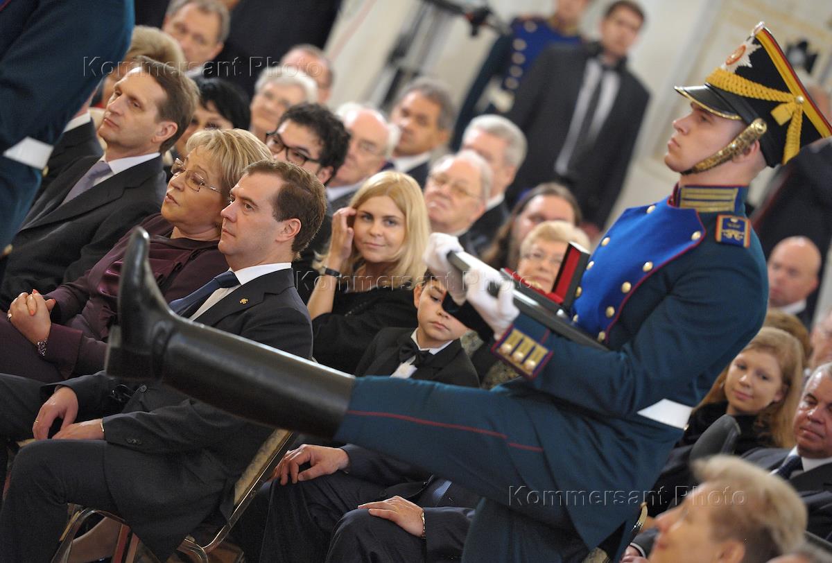 Председатель правительства России Дмитрий Медведев (слева) во время церемонии вручения Государственных премий России за 2011 год. Церемония прошла в Георгиевском зале Большого Кремлевского дворца.