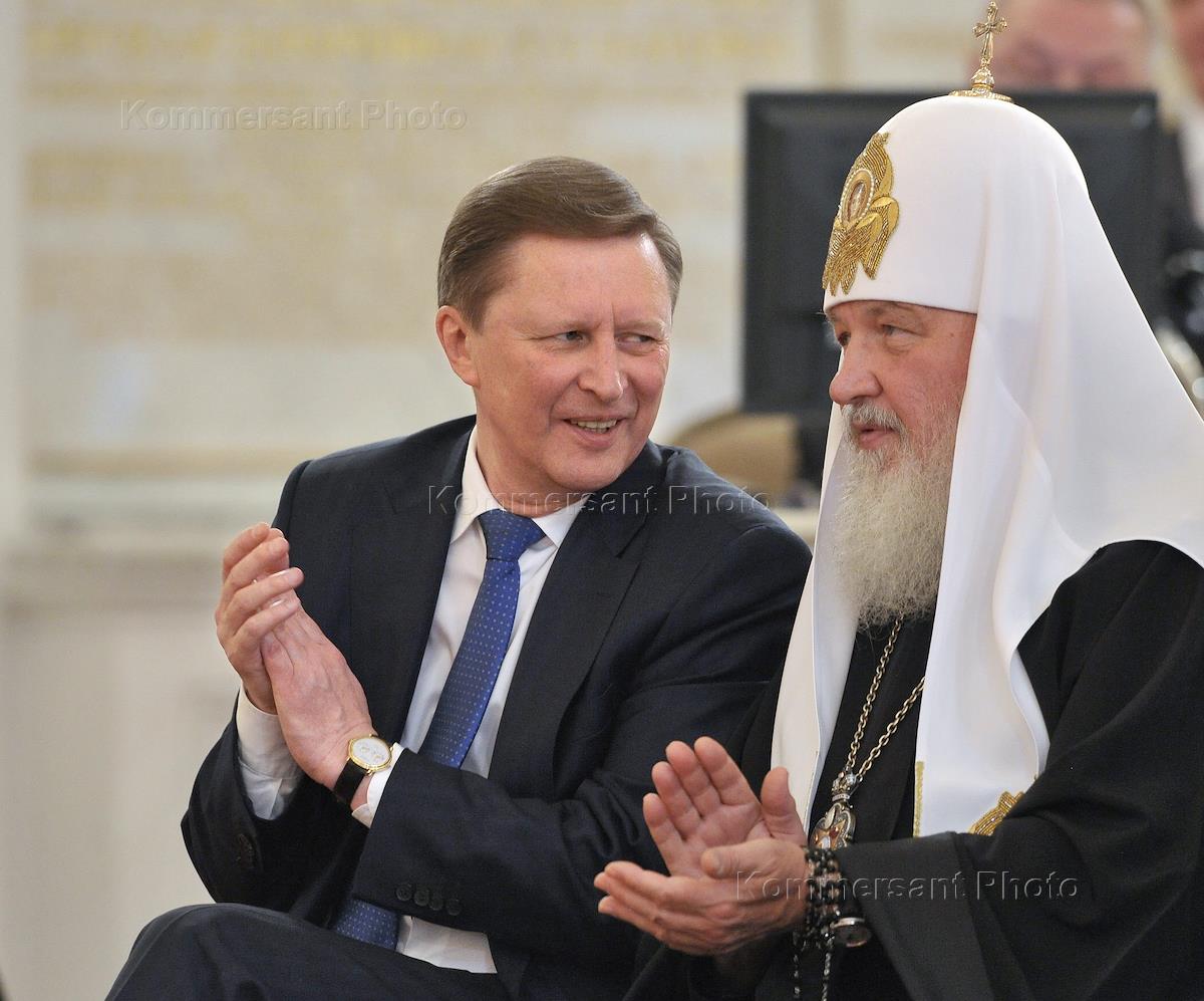 Руководитель администрации президента России Сергей Иванов (слева) и Патриарх Московский и Всея Руси Кирилл (справа) во время церемонии вручения Государственных премий России за 2011 год. Церемония прошла в Георгиевском зале Большого Кремлёвского дворца.