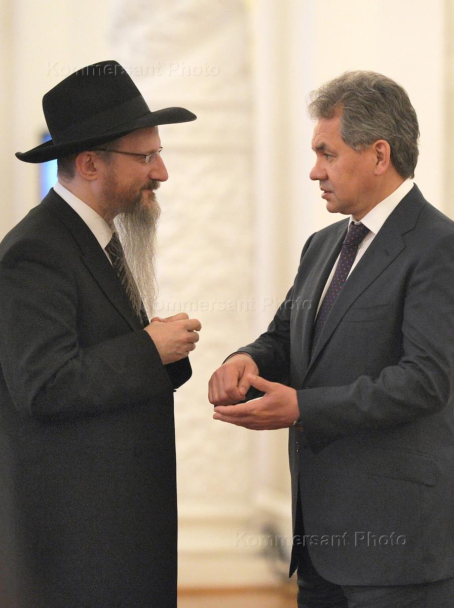 Главный раввин Федерации еврейских общин России Берл Лазар (слева) и губернатор Московской области Сергей Шойгу (справа) перед началом церемонии вручения Государственных премий России за 2011 год. Церемония прошла в Георгиевском зале Большого Кремлевского дворца.