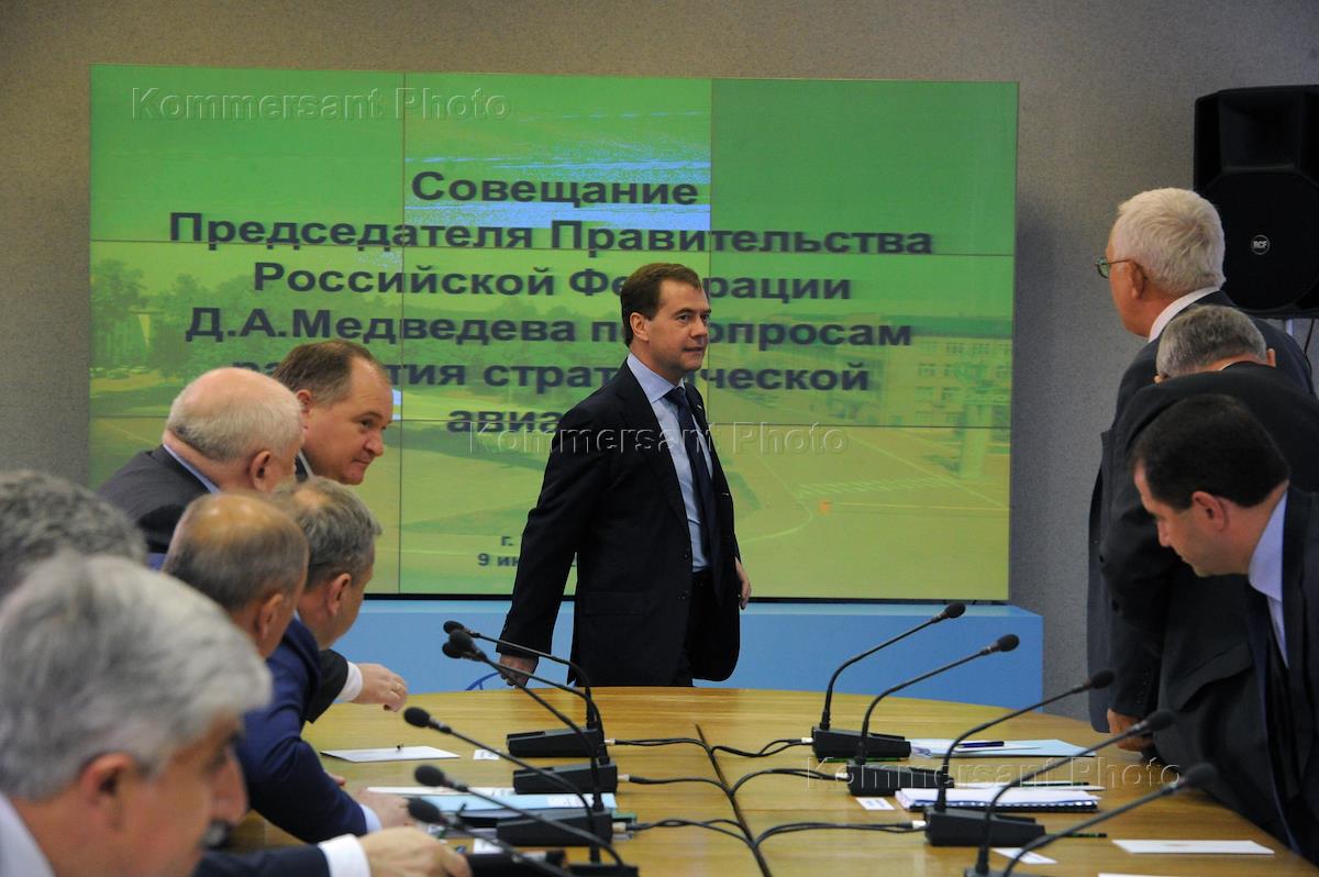 Russian Prime Minister Dmitry Medvedev (center) during the meeting on the Strategic Air Command. The meeting was held at the Kazan Aircraft Production Association (KAPA) named after Gorbunov.
