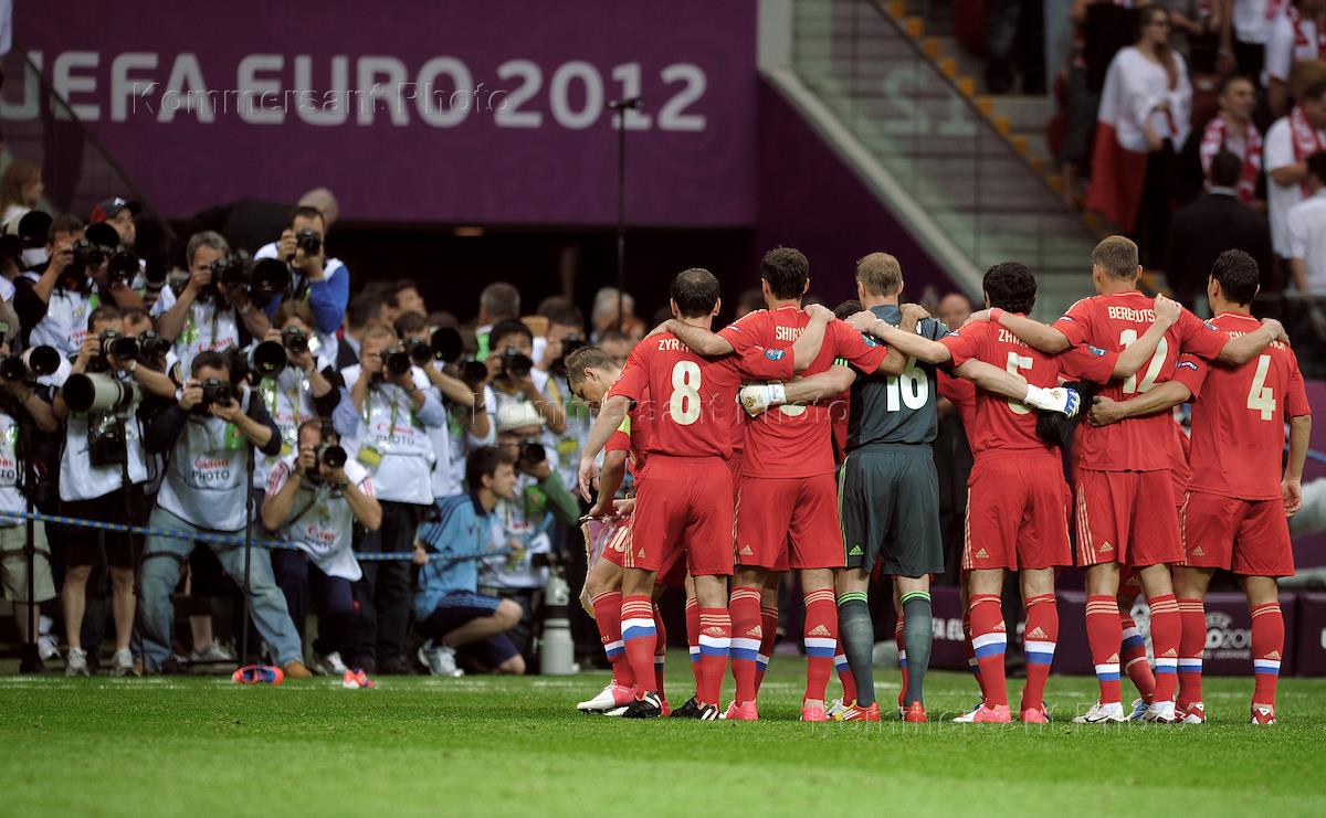 UEFA European Championship Cup "EURO 2012". Russia's players left-right: Igor Denisov, Alexander Kerzhakoved and Alan Dzagoev during a match between the teams of Russia and Poland at the National Stadium.