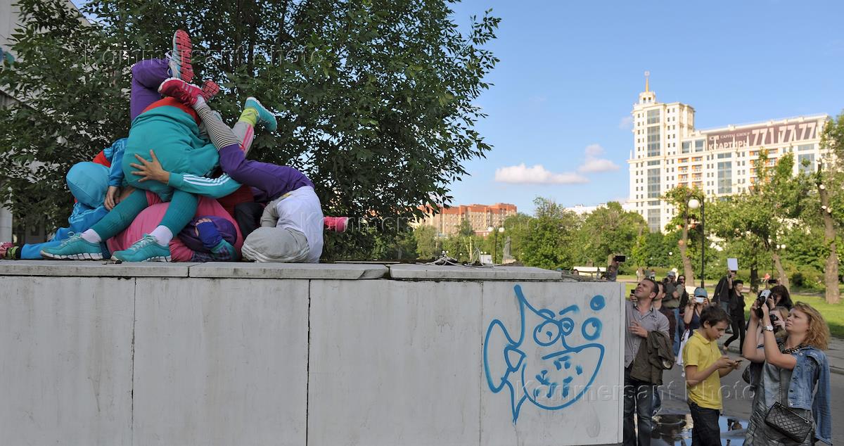 Participants of the performance by Austrian choreographer Willi Dorner "The Body in the urban environment" in front of the Gorky Park.