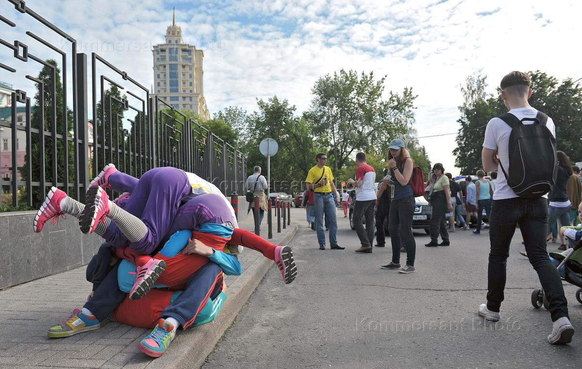 Participants of the performance by Austrian choreographer Willi Dorner "The Body in the urban environment" in front of the Gorky Park.