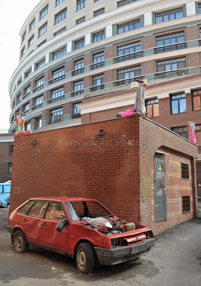 Participants of the performance by Austrian choreographer Willi Dorner "The Body in the urban environment" in front of the Gorky Park.