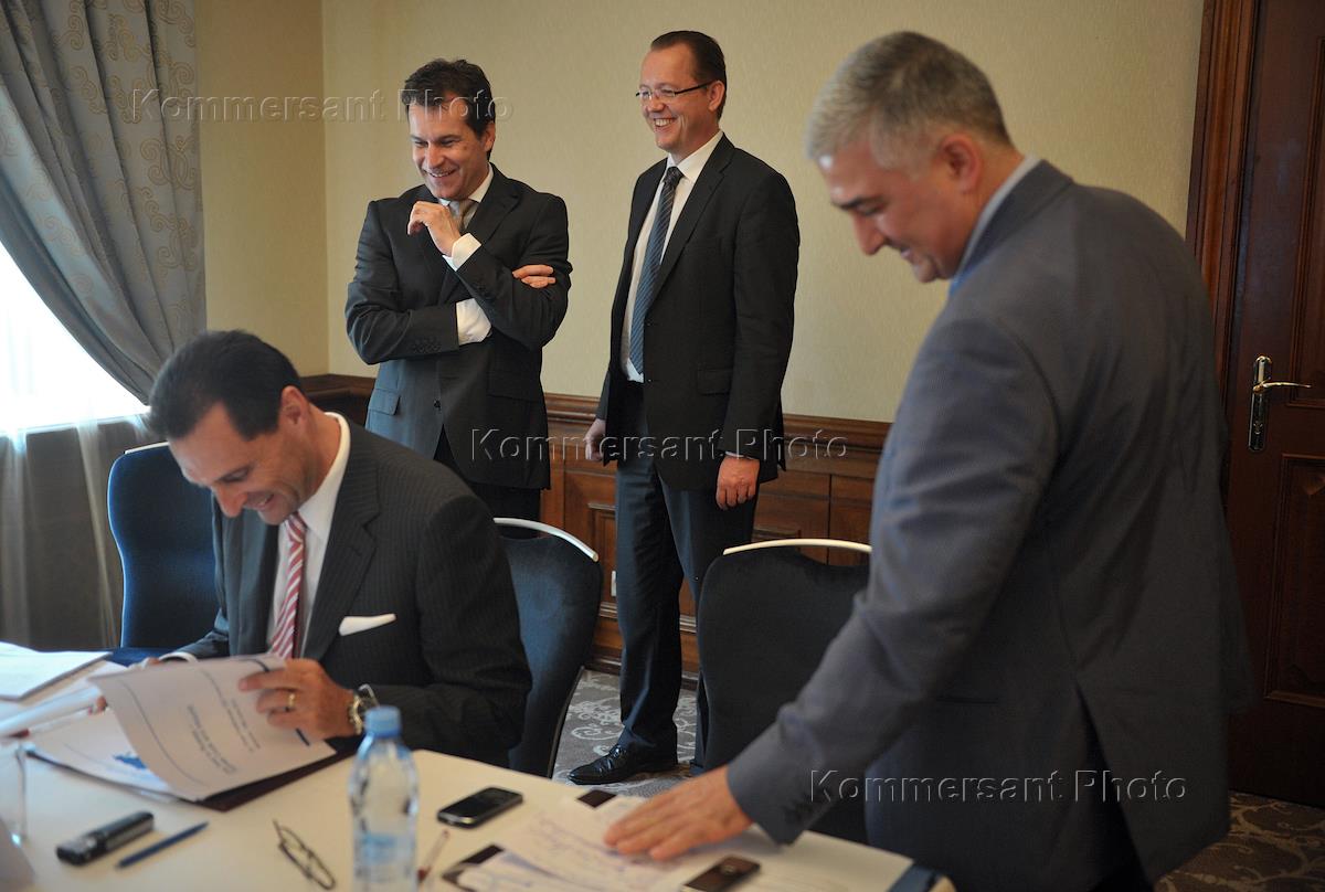 From left to right: General Director of the group Thomas Cook Peter Fankhauser, General director of Intourist - Thomas Cook Thomas Hon and General Director "STC "Intkrist" Victor Topolkaraev at a news conference on the anniversary of the establishment of the Intourist - Thomas Cook joint venture. The press conference was held in the Marriott Royal Aurora hotel.