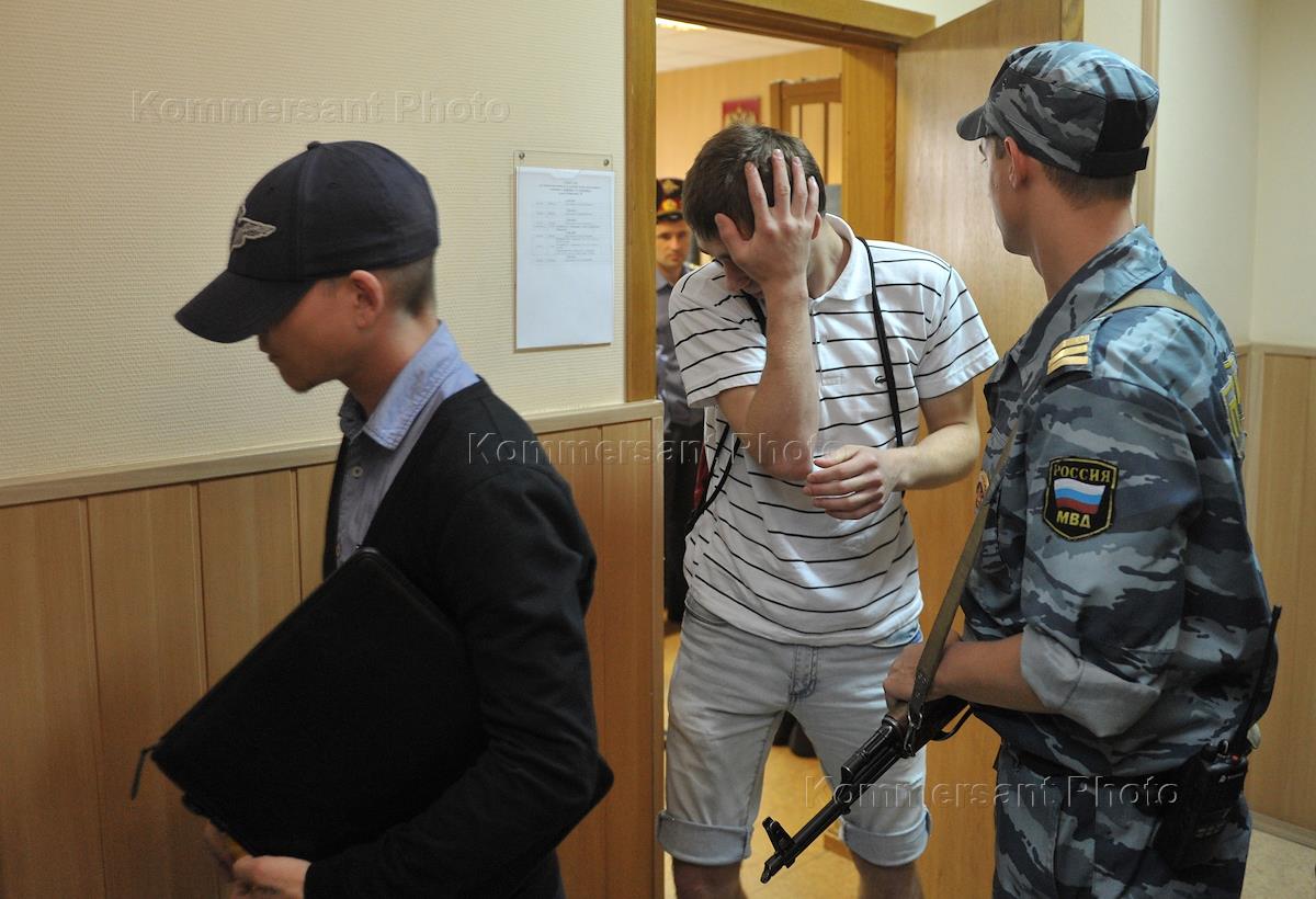 Один из участников массовых беспорядков на Манежной площади в декабре 2010 года Григорий Бильченко (слева) после началом рассмотрения уголовного дела в Тверском районном суде.