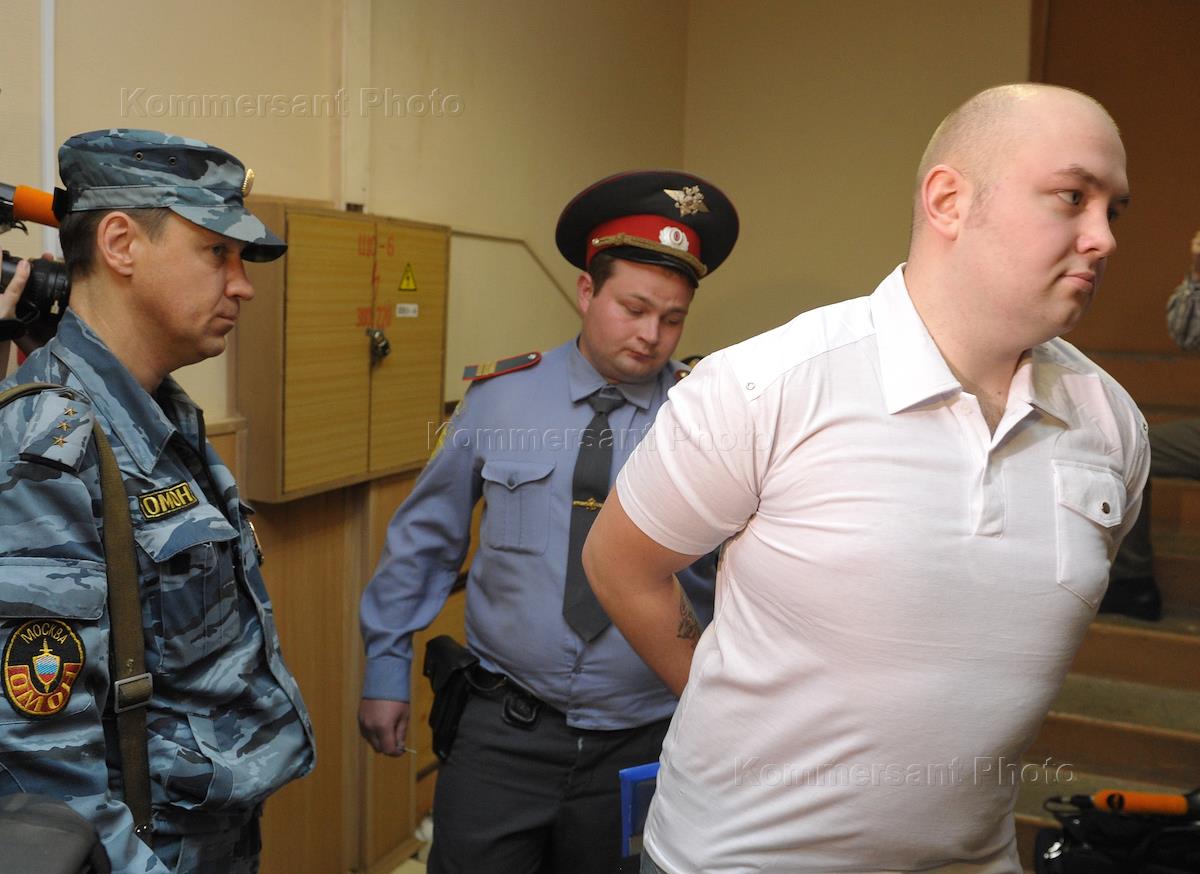 Один из участников массовых беспорядков на Манежной площади в декабре 2010 года Николай Двойняков (справа) после рассмотрения уголовного дела в Тверском районном суде.