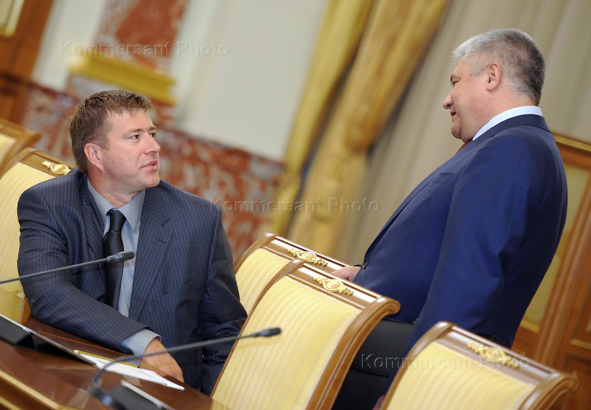 Minister of Communications and Mass Communications Nikolay Nikiforov (left) and Minister for Liasons with the Open Government Mikhail Abyzov during a meeting of the Government of Russia in the House of Government.