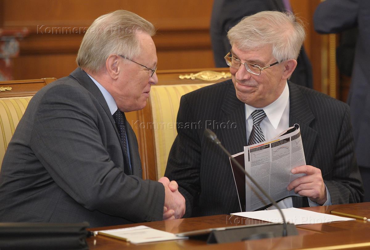 Президент Российской академии наук (РАН) Юрий Осипов (слева) и председатель Центрального банка России Сергей Игнатьев (справа) во время заседания правительства России в Доме правительства.