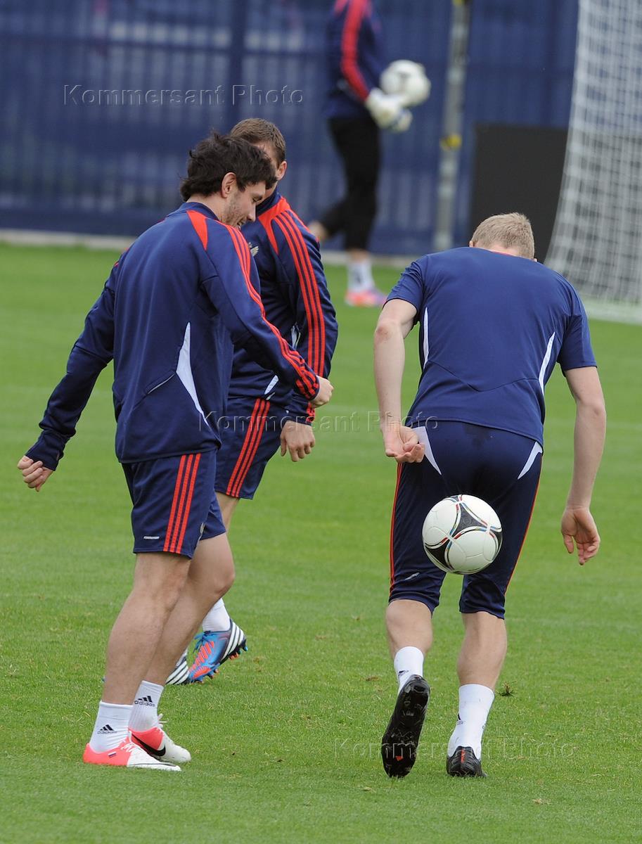 Чемпионат Европы UEFA по футболу "EURO 2012". Слева направо: игроки сборной России Павел Погребняк, Александр Кержаков, Игорь Семшов во время тренировки на стадионе "Националь".