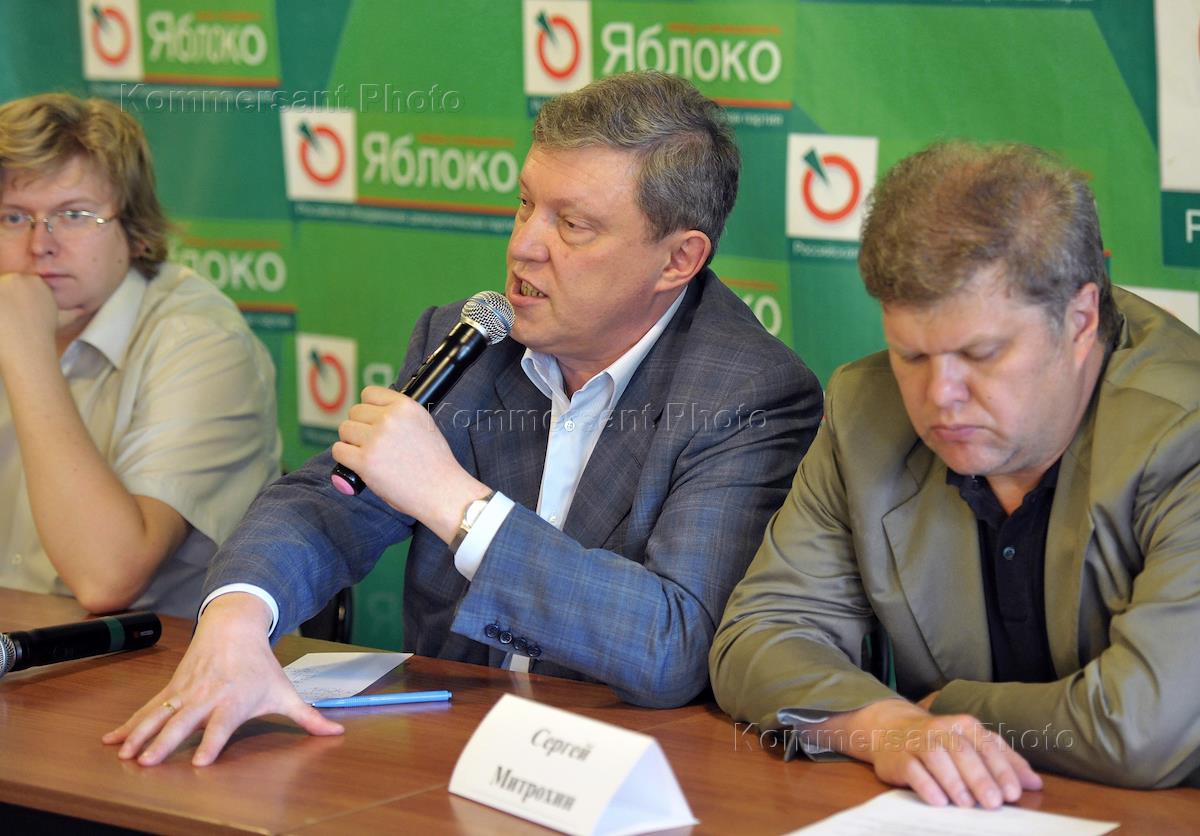 Head of the Yabloko faction in the Legislative Assembly of St. Petersburg, Grigory Yavlinsky(LEFT) AND cHAIRMAN OF THE yABLOKO rUSSIAN uNITED dEMOCRATIC PARTY, sERGEY mITROKHIN during a meeting of the "Round Table" on "Prospects for the strategy and tactics of Social-Democrats in the new political conditions." The meeting was held at the central office of the Yabloko party.