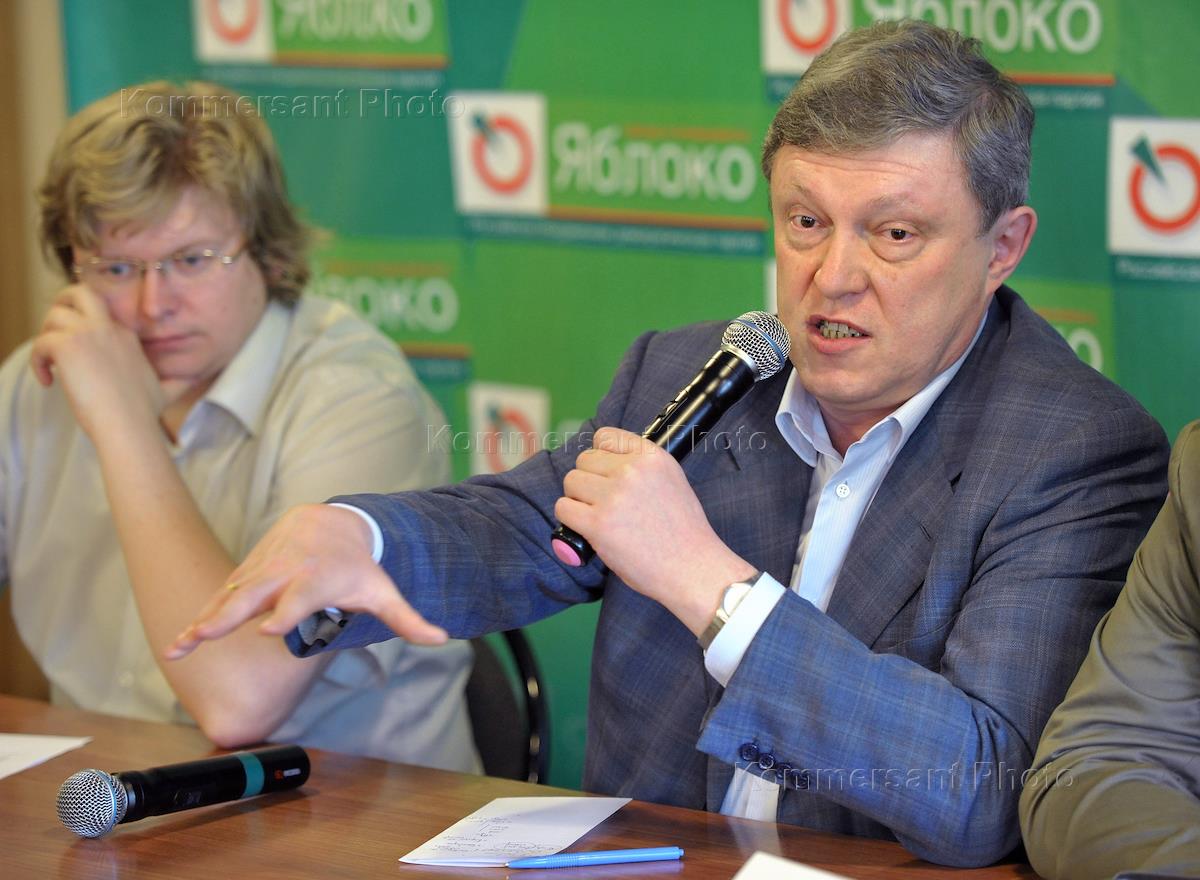 Head of the Yabloko faction in the Legislative Assembly of St. Petersburg, Grigory Yavlinsky(LEFT) AND cHAIRMAN OF THE yABLOKO rUSSIAN uNITED dEMOCRATIC PARTY, sERGEY mITROKHIN during a meeting of the "Round Table" on "Prospects for the strategy and tactics of Social-Democrats in the new political conditions." The meeting was held at the central office of the Yabloko party.