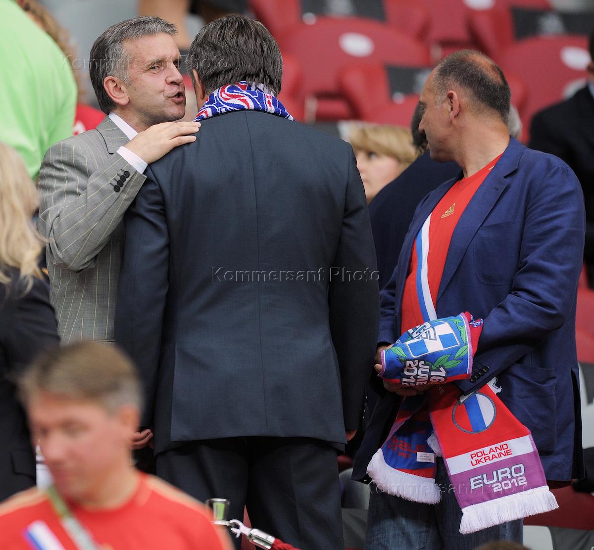 UEFA European Championship Cup EURO 2012. Russian ambassador to Ukraine Mikhail Zurabov (left) and Minister of Sports of Russia Vitaly Mutko (centre) before the match between the national teams of Russia and Greece. The match was held at the National Stadium.