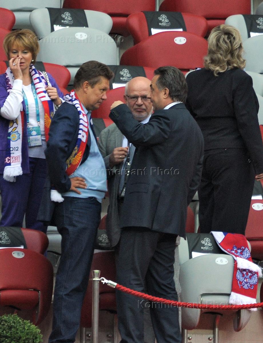 Чемпионат Европы UEFA по футболу "EURO 2012". Слева направо: председатель правления компании "Газпром" Алексей Миллер, председатель Совета при президенте России по развитию гражданского общества и правам человека Михаил Федотов и министр спорта России Виталий Мутко во время матча между сборными командами России и Греции. Матч прошел на Национальном стадионе.