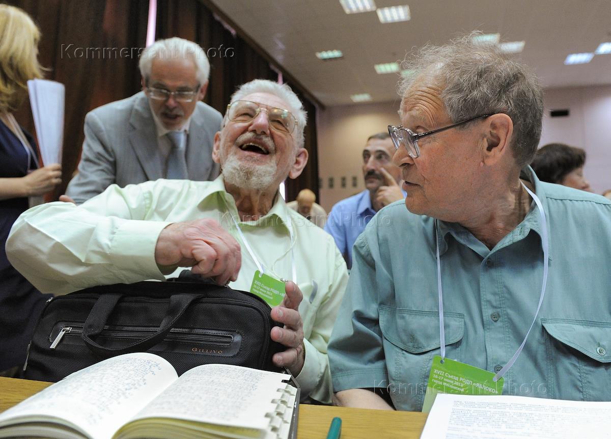 Members of the political committee of the party "Yabloko" Viktor Sheinis (left) and Sergey Kovalyov (right) at the XVII Congress of the Party "Yabloko".