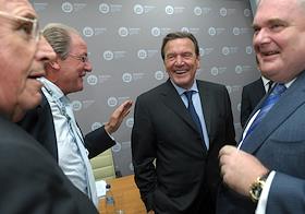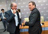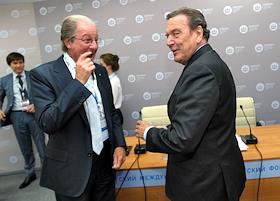 XVI Петербургский Международный экономический форум. Председатель совета директоров компании Linde AG Вольфганг Райтцле (слева) и председатель комитета акционеров компании "Северный Поток" (Nord Stream) Герхард Шредер (справа) на церемонии подписания соглашения между компанией "Сибур" и Linde AG.
