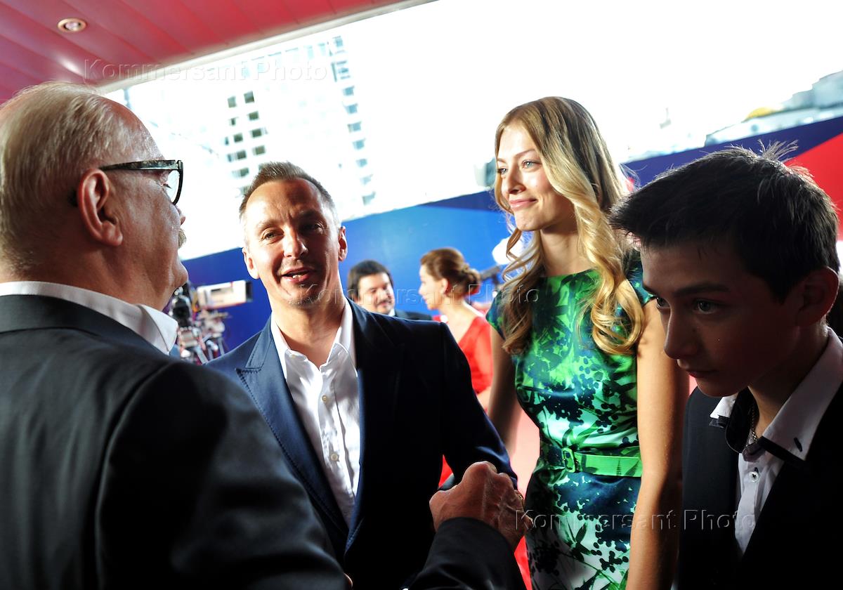 XXXIV Московский международный кинофестиваль (ММКФ). Слева направо: председатель союза кинематографистов России, кинорежиссер Никита Михалков, ресторатор Степан Михалков с супругой Елизаветой на церемонии открытия в кинотеатре "Октябрь".