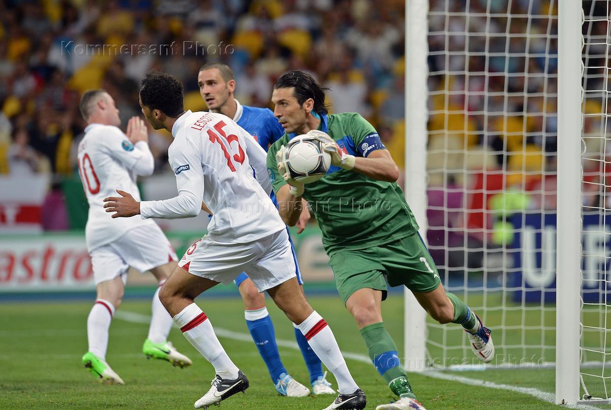 Чемпионат Европы UEFA по футболу "EURO 2012". 1/4 финала. Вратарь сборной команды Италии Джанлуиджи Буффон (слева) во время матча между сборными командами Англии и Италии. Матч прошел на стадионе "Олимпийский".